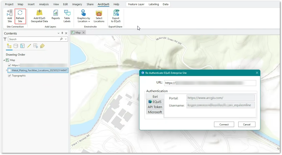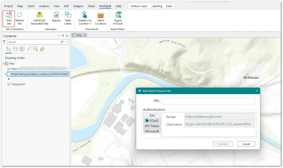 6.Click OK. When the EQuIS Enterprise site connects, a group layer named with the connected URL is added to the map.