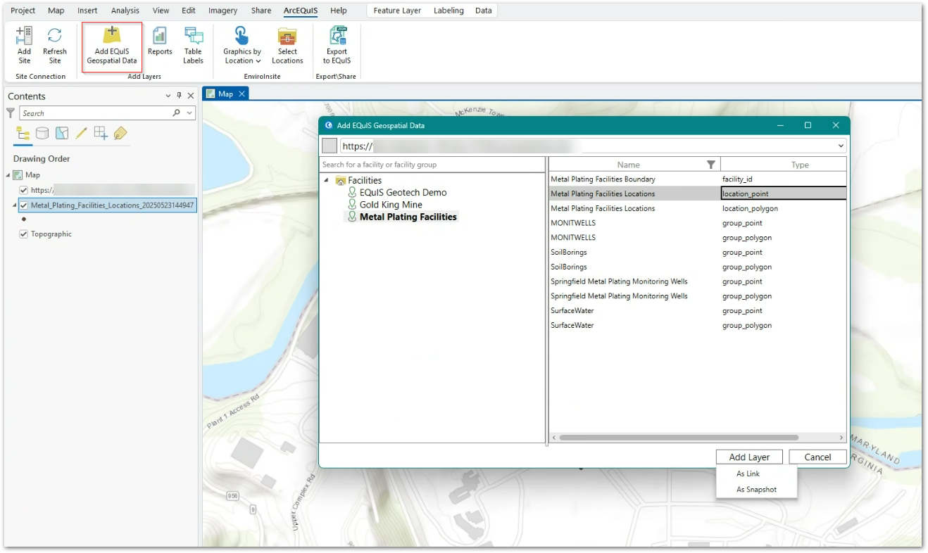 2.The Add EQuIS Data window displays all facilities to which a user has access in the left pane. Facilities can be searched using Facility Name, Facility Code, or Facility ID. Select a Facility or Facility Group to display the available data layers on the right pane: