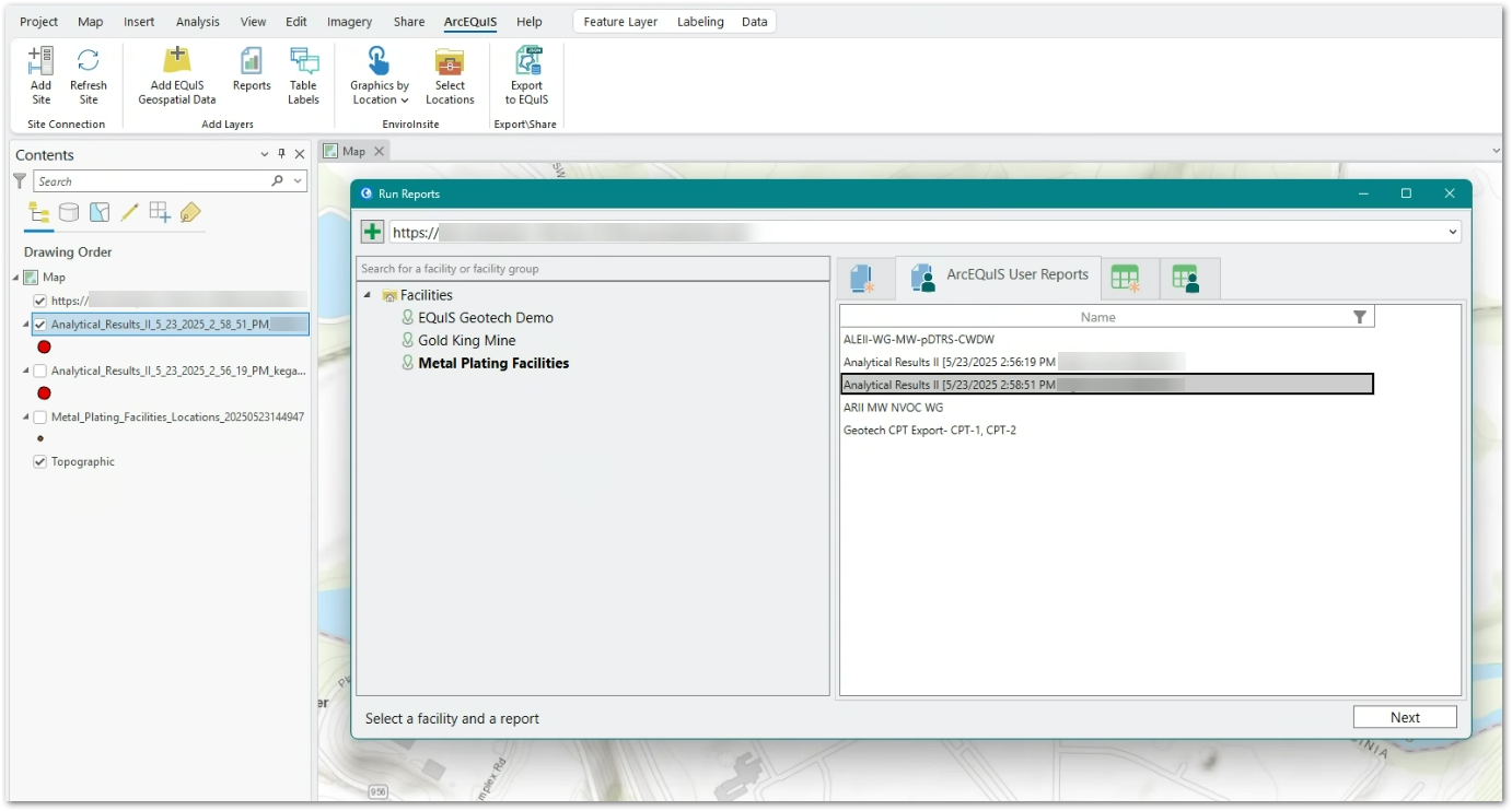 Users can run EQuIS reports (that include X and Y coordinates in the output) directly in ArcGIS Pro and automatically add the report output to the map as either a Link or Snapshot layer. The base reports need to be published to the database to be available in the Reports modal.