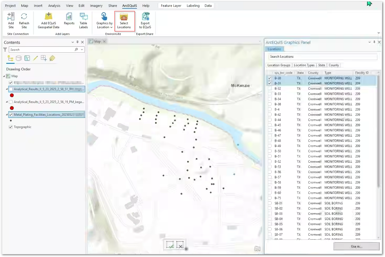The Select Locations tool can be used to select locations from either an EQuIS Facility Locations Points layer or an EQuIS Report layer. To use this tool, first add a Facility Location Layer or an EQuIS Report to the map. Then, click the Select Locations button from the ArcEQuIS ribbon to open the ArcEQuIS Graphics Panel.