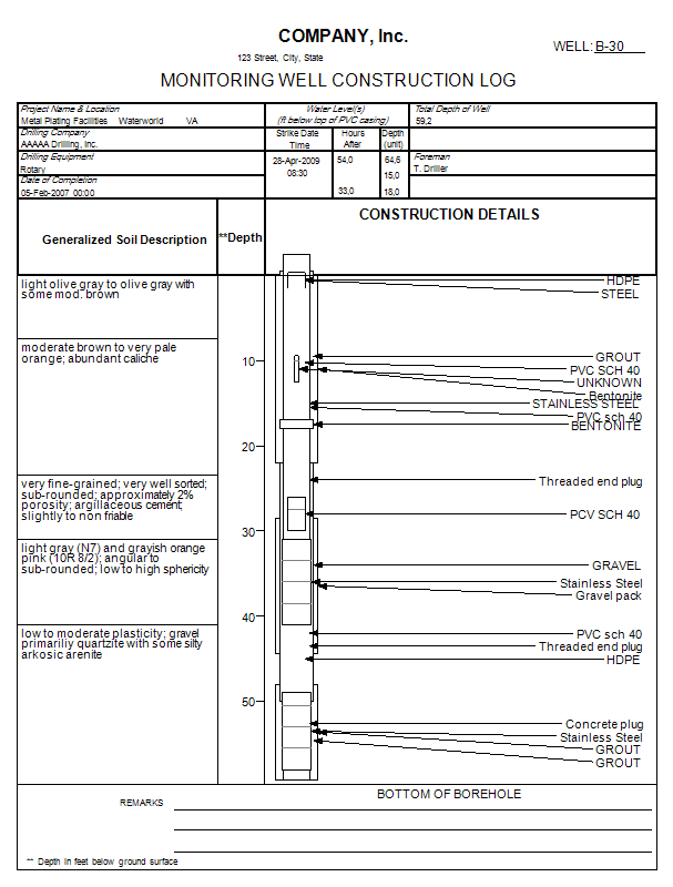 Data plotted in the boring logs is stored in the Wells, Borings, Point Values, and Fill tables in the EnviroInsite database files. The user may use the standard EnviroInsite fields for storage of well ID, strata, or coordinate data, however, they are not constrained by the standard field list. Users may also elect to create their own set of fields within the Wells and Borings tables. Custom fields within the Wells table are used for posting text or numeric data in the log header areas. Custom fields within the Borings tables are used for posting numeric data or text descriptions associated with the strata intervals and appear in the downhole portion of the log reports. The Point Values table stores data that is posted in the downhole portion of the log reports that is not necessarily associated with a strata interval. It may be used to post text comments or to report point measurements, such as PID measurements or blow-counts.