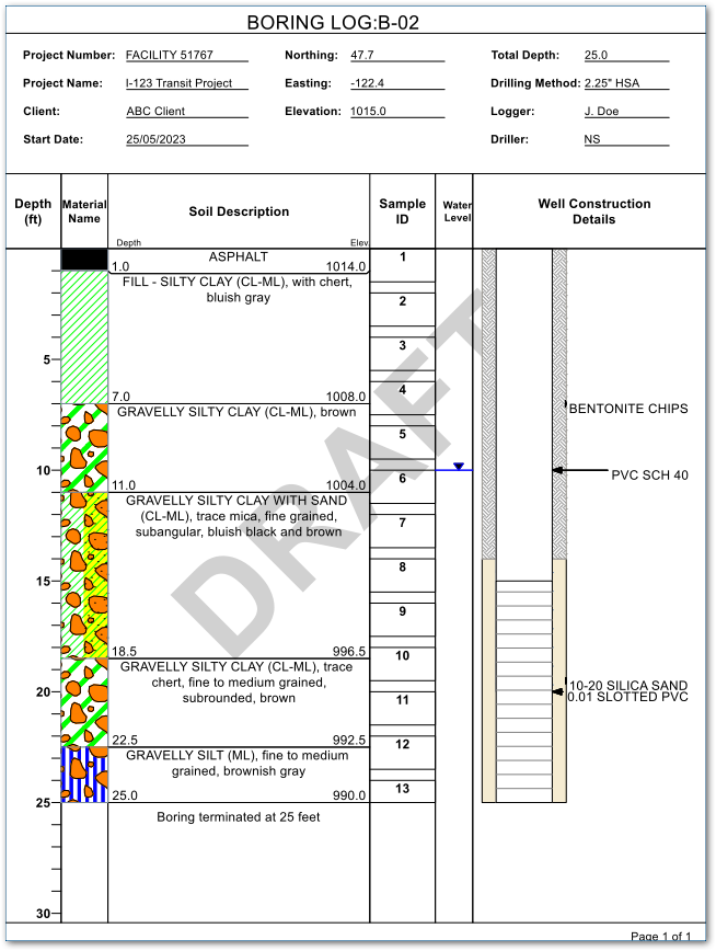 For EQuIS database users, the source tables and fields are described in the Tables and Fields used to Generate Full-Page Boring Logs page.