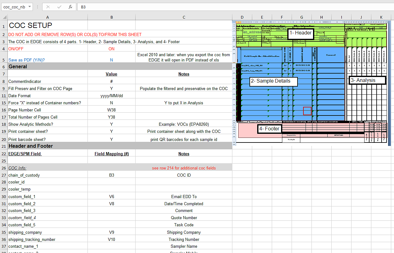 The Setup sheet in the COC_Template file in EDGE can be used to change settings, set values and/or build a custom Chain of Custody (COC) template. This does not require editing VBA code or macros in Excel.