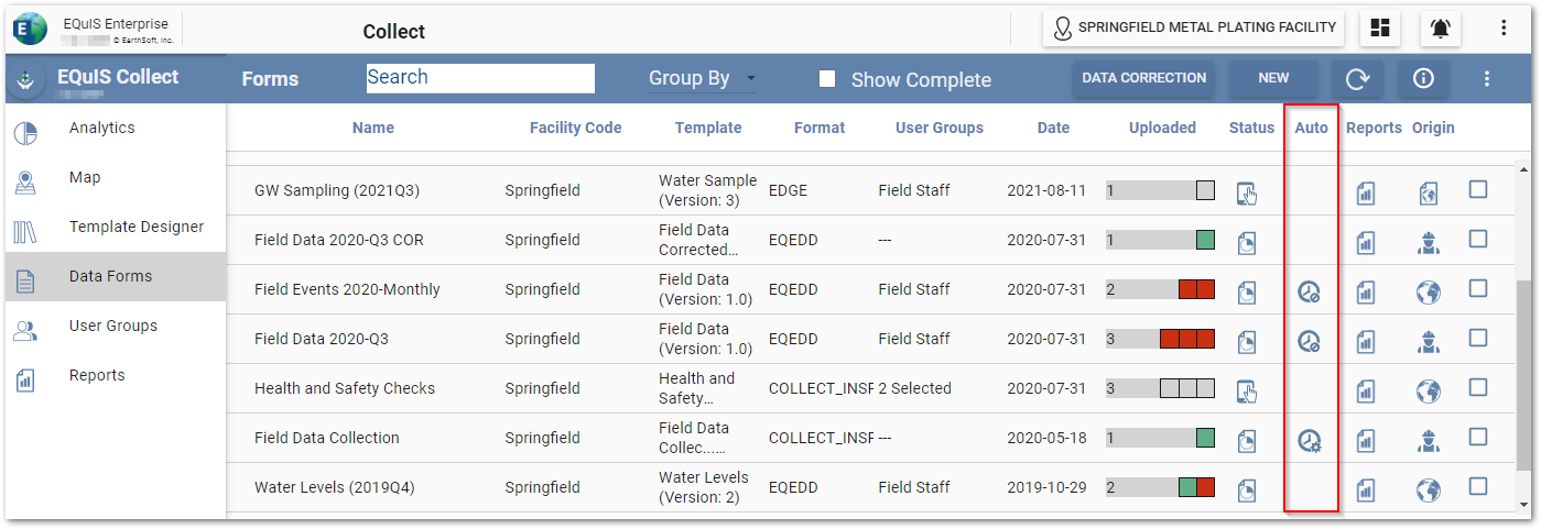 The Auto Completion status of data forms can be seen on the Data Forms page under the Auto column.