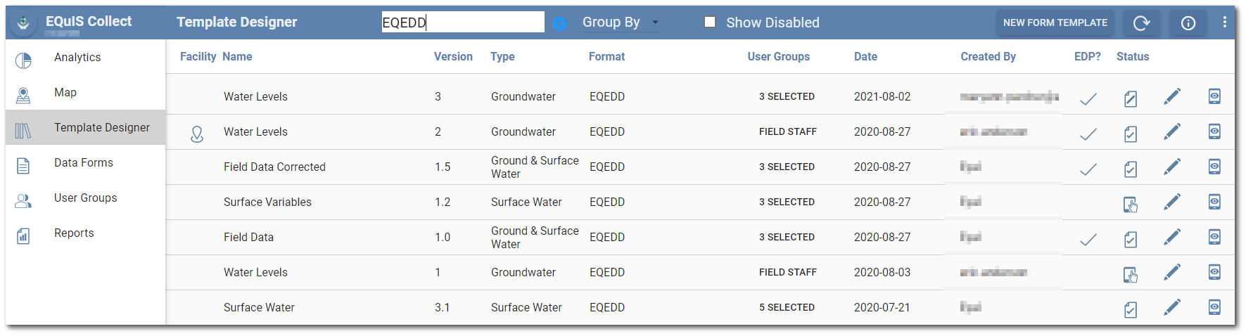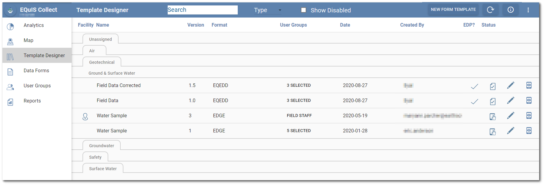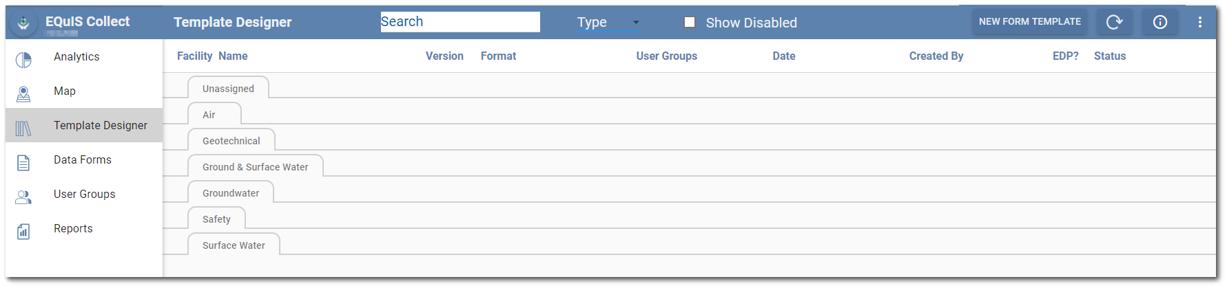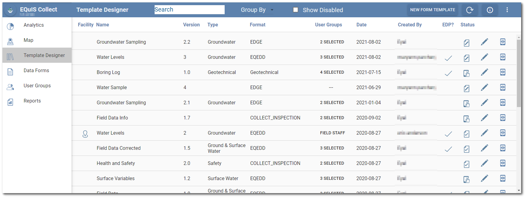 Forms used in the Collect Mobile app can be designed and built using Collect Enterprise. Form templates are designed and then published to be accessible on the Collect Mobile app. A template is a collection of pre-defined forms that contains fields with various attributes, data mapping to an EQuIS format, formulas (as needed), and possibly pre-populated with data. A new template can be created entirely from scratch or can be based on an existing template.