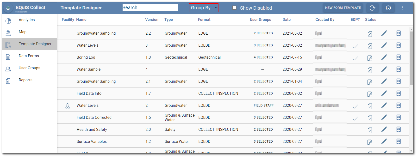The templates can also be organized based on the categories in the Facility, Type, Format, Date, Created By or Status columns. To organize the templates, click the Group By selector button at the top of the page to open a drop-down menu and choose the desired column.