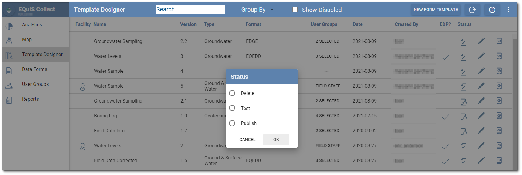 Templates should be tested before they are published so that they can be modified without having to create a new template with each change. Templates in Test mode can be modified, but data captured from these forms will not be pushed to the database. Test mode should be used exclusively for testing the functionality of a template, prior to the template being published, and not for field data collection purposes. All Data Forms and collected data associated with a template will be deleted when the template is edited, which includes when publishing the template. See the Publish Forms on Mobile App article for more information. A published template may be disabled, but a disabled template cannot be re-enabled and set to Publish.