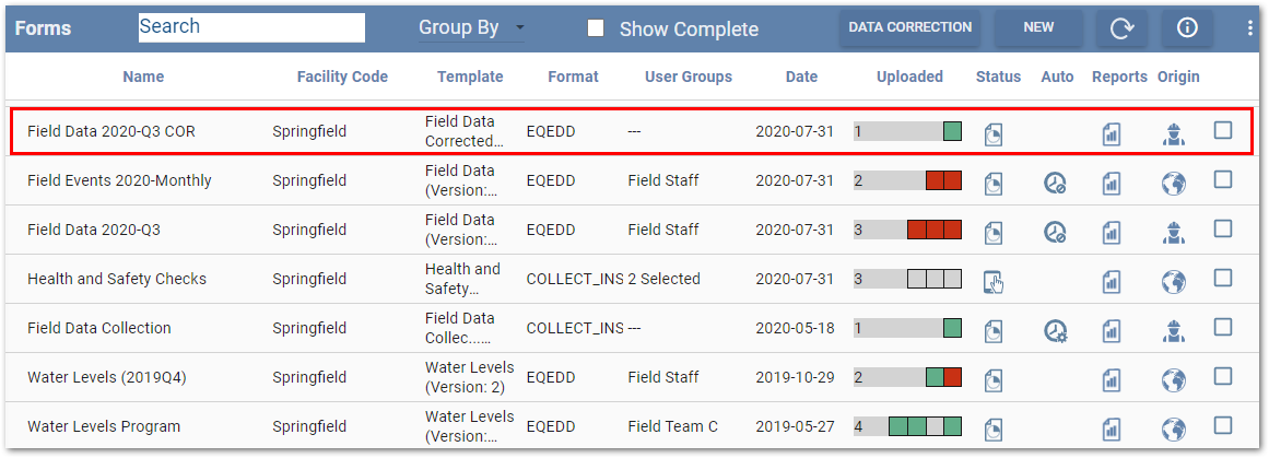 Tip: Once the new corrected data form is created and processed, users may want to remove the previously pushed data forms from displaying on the Data Forms page. To remove a data form from displaying on the page, click the Status icon for the data form and select Yes to mark the form as complete. The data form is still available, but will not display on the Data Forms page (unless the Show Complete box is checked). |