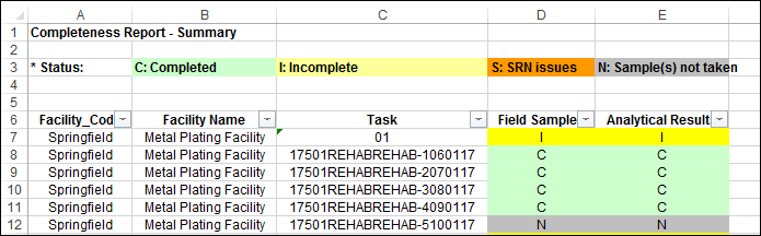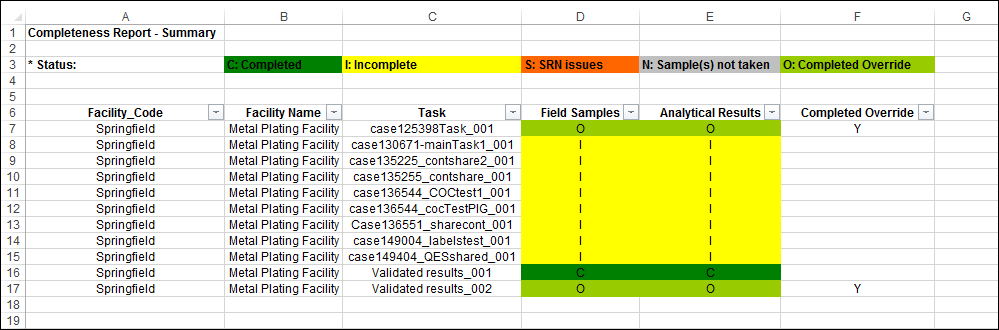 Overview: The Summary report is typically used for an overview of all tasks in a facility. Tasks that only contain activities will not show up in this report. For a more detailed view of task status, including Activity status, we recommend using the SPM - Completeness Report - Detailed report. The status of the "Field Samples" and "Analytical Results" columns follow the corresponding rules: