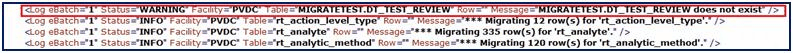 The error log will provide general information about the data rows. If a warning is shown, the data was not migrated. Note that the facility migration code has been updated so that only action levels with DT_ACTION_LEVEL.FACILITY_ID populated will be associated with the new FACILITY_ID upon migration. If the FACILITY_ID is NULL in the source table, it will be left NULL in the new database.