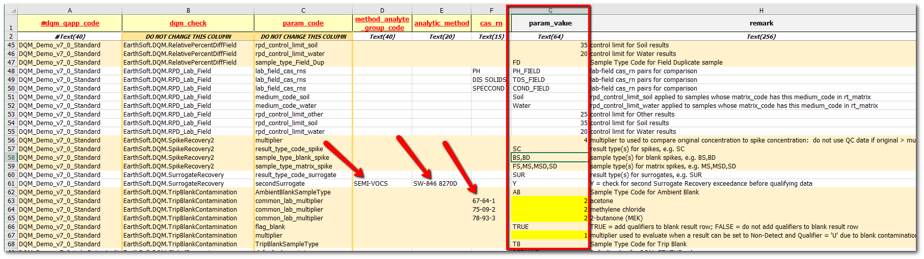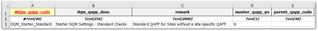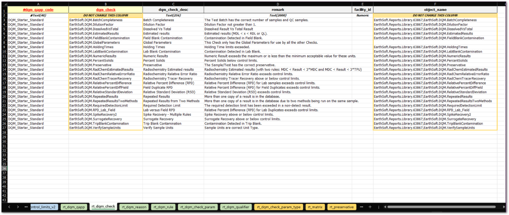 a.Open the DQM QAPP EDD to the RT_DQM_CHECK_PARAM spreadsheet. The DQM Starter QAPP file comes pre-populated with all the parameters for all available DQM checks.