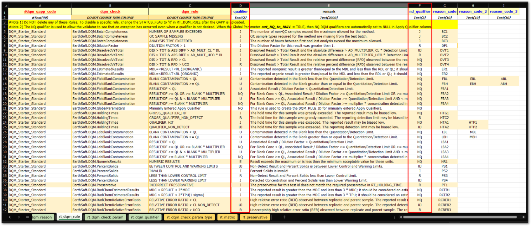 a.Open the DQM QAPP EDD to the RT_DQM_RULE spreadsheet. The DQM Starter QAPP file comes pre-populated with all rules for the DQM checks.