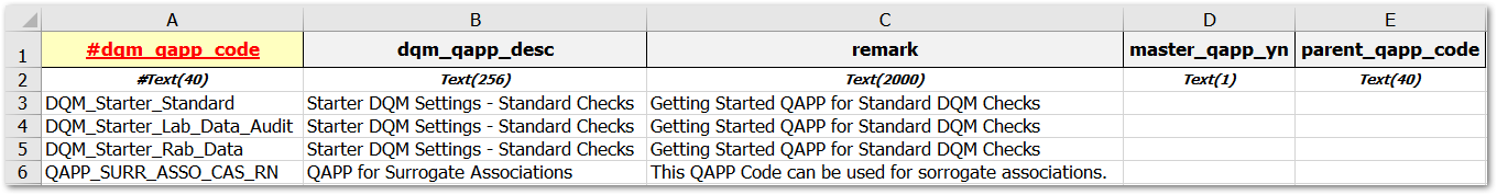 c.Edit the DQM_QAPP_CODE to match your input in Step 1. (Hint: A global Find and Replace with the "Within" option set to "Workbook" is best for changing the DQM_QAPP_CODE). Continuing with the above example, the RT_DQM_CHECK tab would be changed as shown below.