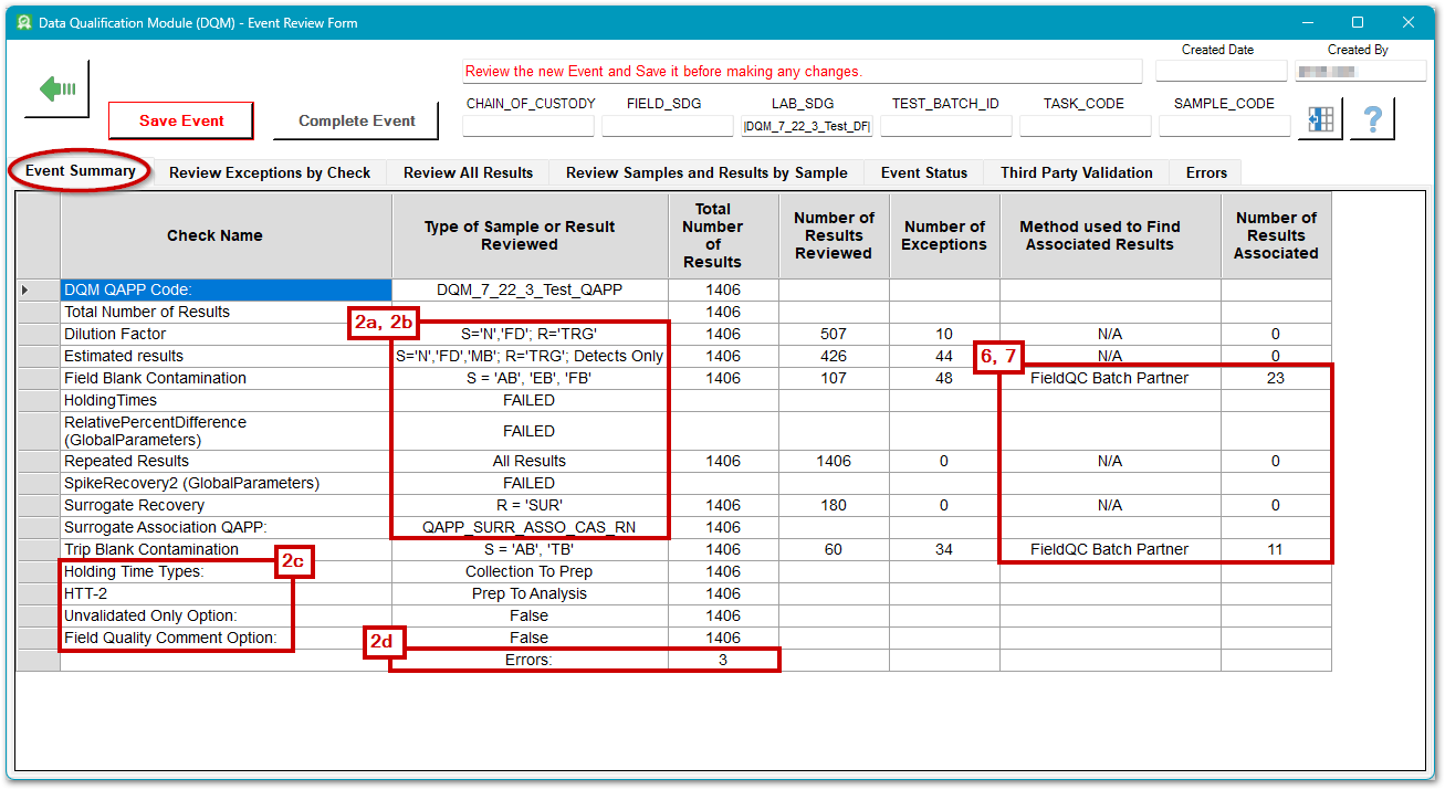 When the Start DQM Event process finishes, the DQM Event Review Form opens and displays results in a series of tabs: