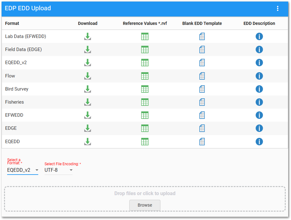 Any registered format files will be displayed in the EDP EDD Upload widget. Enterprise EDP format registration consists of a set of records in the ST_CONFIG table for each registered format name (see efdManagementConfiguration.EFD for more details). Formats can be registered and managed using the Workflow widget or via EQuIS Professional by adding entries to ST_CONFIG, see Add or Modify Enterprise EDP Formats for steps. The EDP EDD Upload widget also provides for download of format files, reference value files (.rvf), blank EDD files, and EDD description files for all registered formats by clicking on the icons or the format file name.