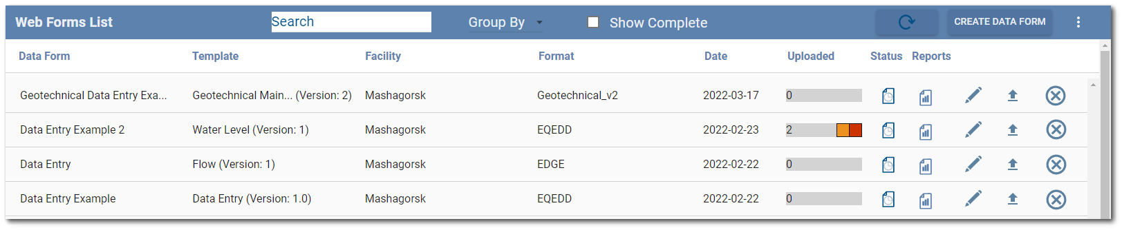 – Data form is archived. This status is set by an Enterprise user by clicking the Testing or In Progress status icon and confirming to mark the form as complete. The data form is not visible on the Web Forms List unless the “Show Complete” check box on the widget header is enabled.