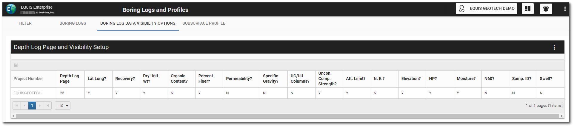 Settings on the Boring Log Data Visibility Options tab control how boring logs will be displayed/output on the Boring Logs tab and Subsurface Profile tab. The "Depth Log Page and Visibility Setup" widget is a pre-configured EQuIS Geotech - Project Parameter Setup widget.