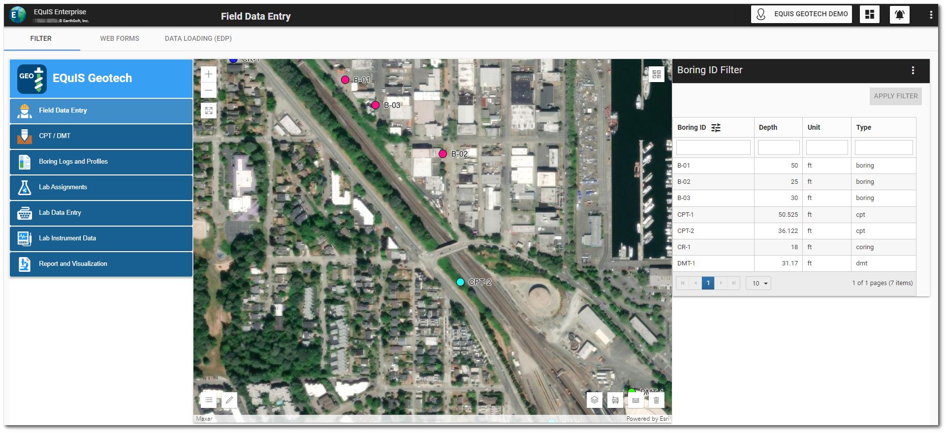 The Filter tab on the Field Data Entry dashboard contains a Map widget and a Data Grid widget (i.e., Boring ID Filter) configured to filter by location.