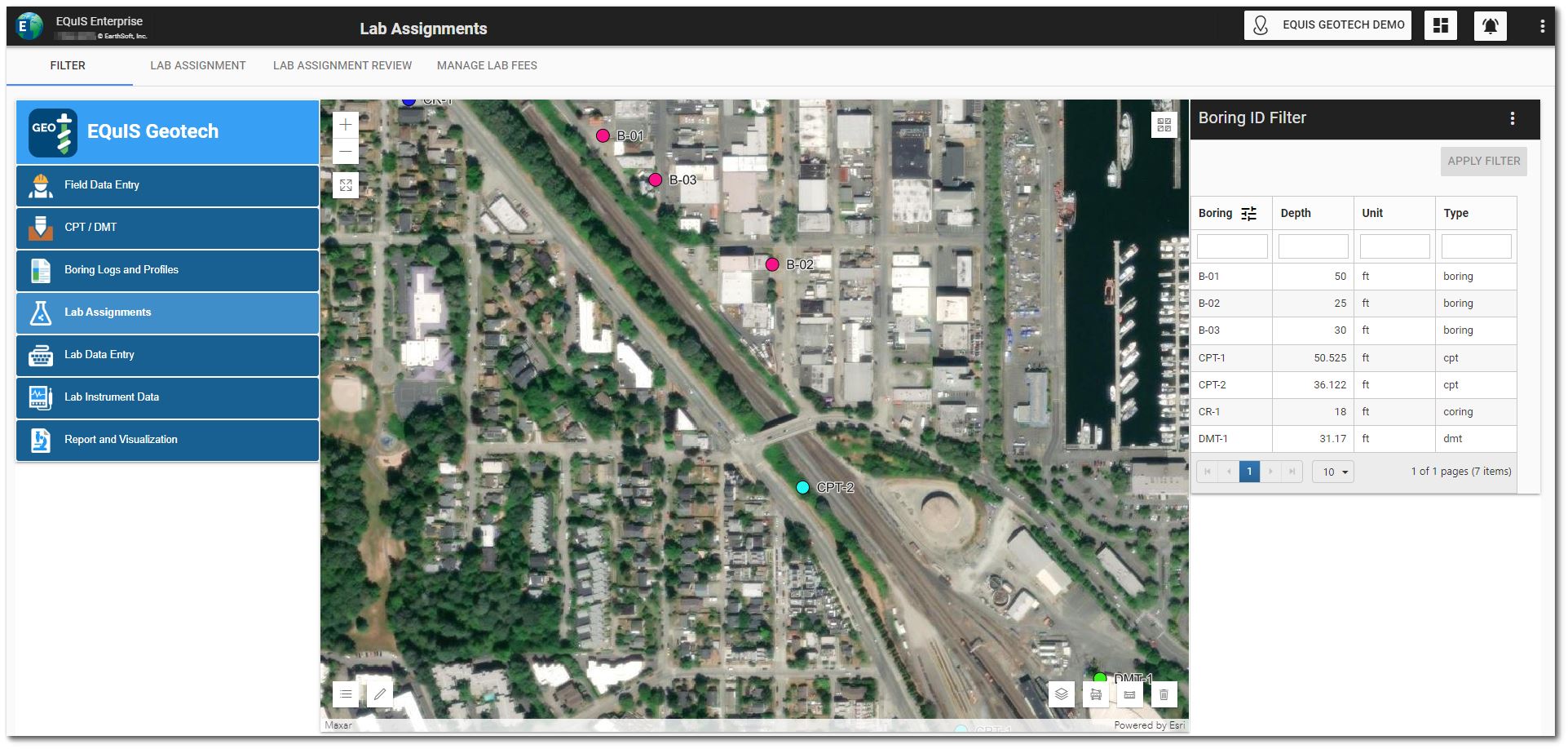 The Filter tab on the Lab Assignments dashboard contains a Map widget and a Data Grid widget (i.e, Boring ID Filter) configured to filter by location.