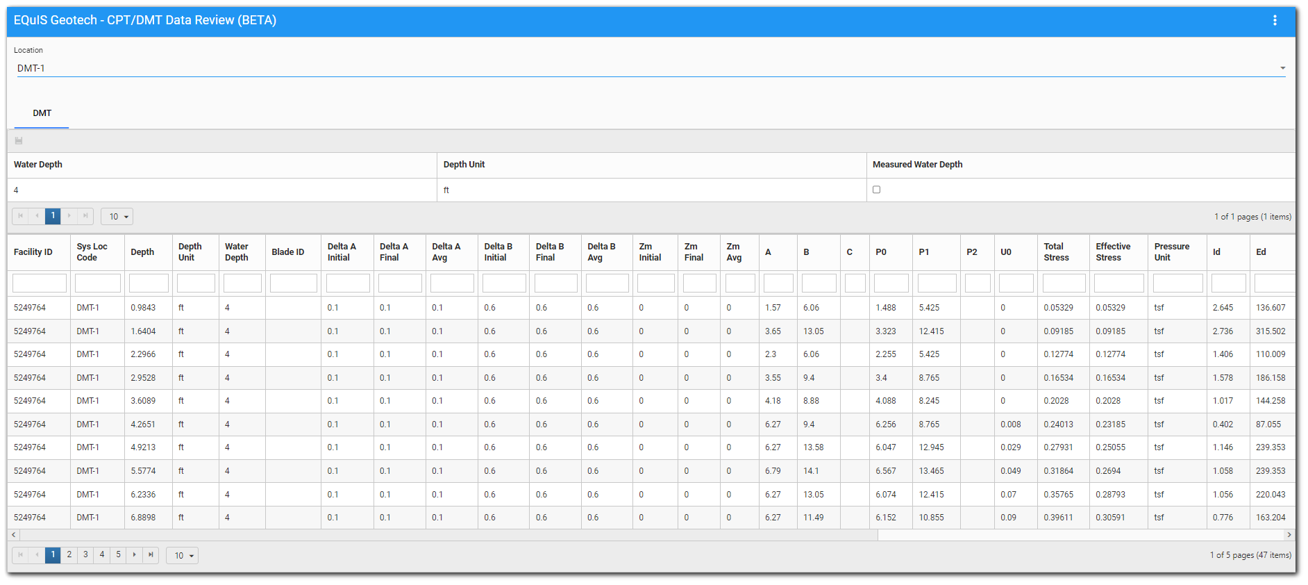 •Bottom Grid – The bottom grid is always read only and displays results from the Geotechnical DMT Data report (EQUIS.GEOTECH_DMT_DATA database function contained in the Geotech Schema). Updates to the top grid will be reflected in this grid after saving and the report loads again.