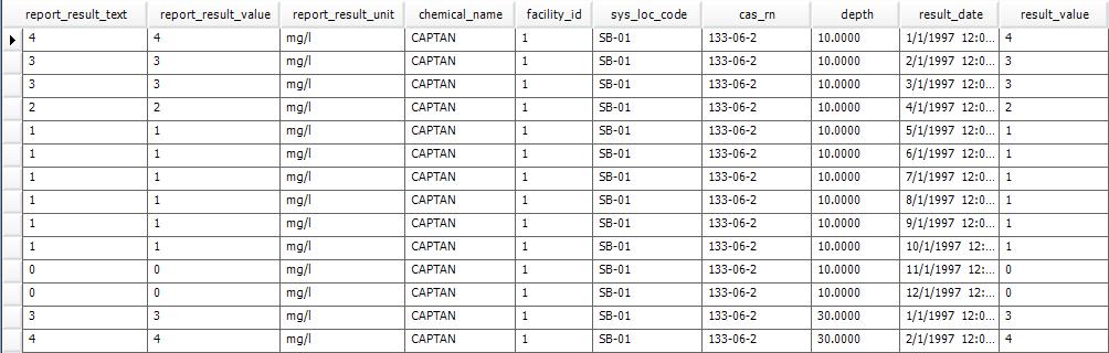 REPORT_RESULT_TEXT REPORT_RESULT_VALUE REPORT_RESULT_UNIT CHEMICAL_NAME FACILITY_ID SYS_LOC_CODE CAS_RN, DEPTH RESULT_DATE RESULT_VALUE RESULT_UNIT |