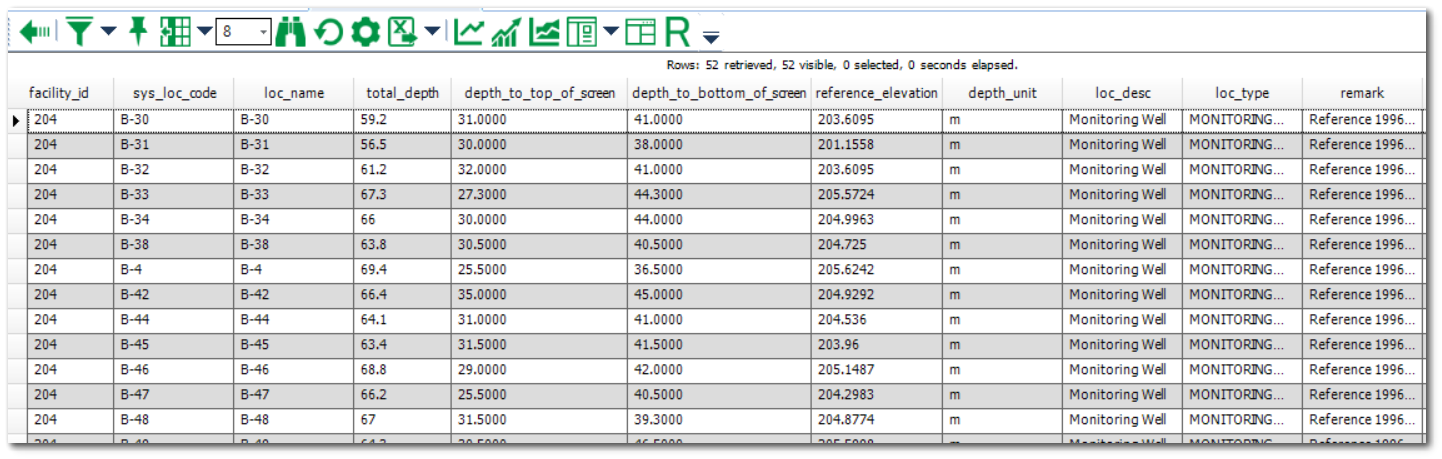 FACILITY_ID SYS_LOC_CODE LOC_NAME TOTAL_DEPTH DEPTH_TO_TOP_OF_SCREEN DEPTH_TO_BOTTOM_OF_SCREEN REFERENCE_ELEVATION |