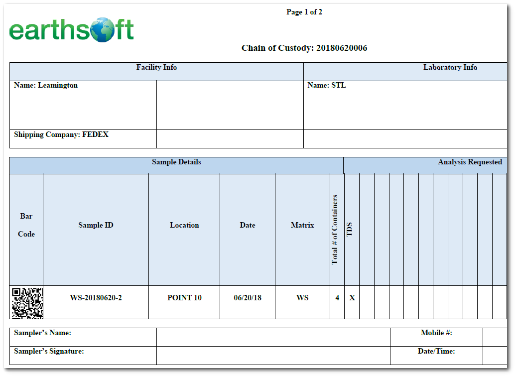 The first data sourced section (i.e., COC related information) has the Chain of Custody ID at the top followed by the Facility and Laboratory Info table. The Facility and Laboratory section will print the following info: