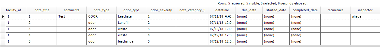 FACILITY_ID NOTE_TITLE NOTE_TEXT NOTE_TYPE NOTE_CATEGORY_1 NOTE_CATEGORY_2 NOTE_CATEGORY_3 CREATED_DATE DUE_DATE STARTED_DATE NOTE_DATE RECURRENCE |