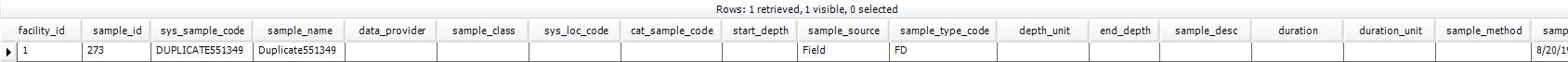 FACILITY_ID SAMPLE_ID SYS_SAMPLE_CODE SAMPLE_NAME DATA_PROVIDER SAMPLE_CLASS SYS_LOC_CODE CAT_SAMPLE_CODE START_DEPTH SAMPLE_SOURCE SAMPLE_TYPE_CODE DEPTH_UNIT END_DEPTH SAMPLE_DESC DURATION DURATION_UNIT SAMPLE_METHOD SAMPLE_DATE REMARK TASK_CODE LAB_SOLUTION_SOURCE |