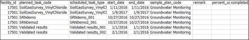 FACILITY_ID PLANNED_TASK_CODE SCHEDULED_TASK_CODE TASK_TYPE START_DATE END_DATE SAMPLE_PLAN_CODE REMARK |