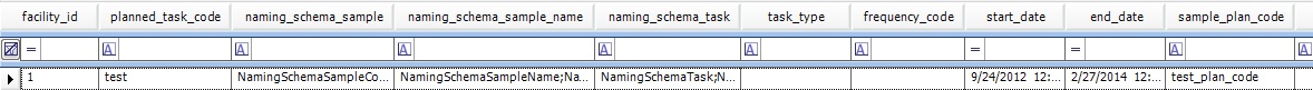 FACILITY_ID PLANNED_TASK_CODE NAMING_SCHEMA_SAMPLE NAMING_SCHEMA_NAME NAMING_SCHEMA_TASK TASK_TYPE FREQUENCY_CODE START_DATE END_DATE SAMPLE_PLAN_CODE SKIP_DATES INCLUDE_DATES |
