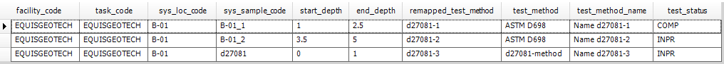 Description: The Geotechnical Lab Test Status report summarizes the status of the geotechnical lab tests of the selected tasks and/or locations (see the Data Mapping of the report output). The output of the report is in a grid format and includes a ‘test_status’ field that reports if the lab test status is complete (‘COMP’) or in progress (‘INPR’). Only samples that have a lab test assigned to them in the DT_GEO_LAB_ASSIGN_TEST table are included in the report output.