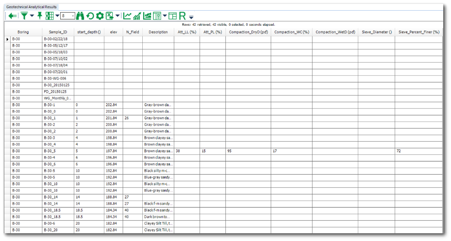 Description: The Geotechnical Analytical Results report returns a combination of geotechnical sample parameters and/or geotechnical analytical results along with locations and their coordinates. If one or more geotechnical test types (e.g., Atterberg limits, compaction, sieve analysis) are selected, then the report will add analytical results columns. Otherwise, only sample parameter report data will be displayed in the output grid. The elevation column will be only populated if the location has matching row for selected “Identifier” and “Coord_Type_Code” in the DT_COORDINATE table. This report can be run in EQuIS Professional or published to EQuIS Enterprise.