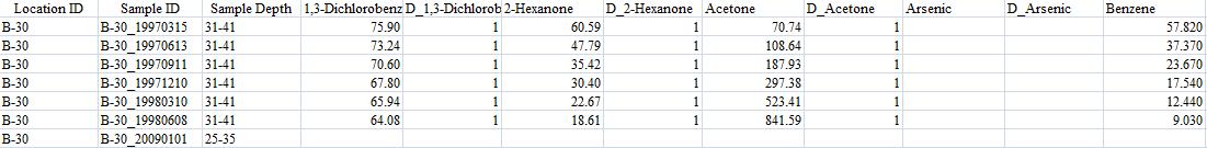 Note: Blank rows may be present in your output when two results for one analyte exist (e.g. Aluminum with two different fractions, T and D), but only one result exists for another analyte in the same sample (e.g. Lead).