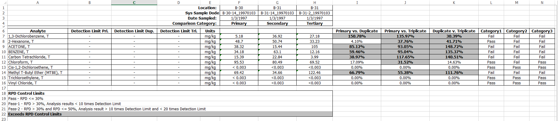 For each of the Categories 1, 2, and 3, the report uses the logic below to 1) check the RPDs against the RPD Lower/Upper control limits (default or user-selected), and 2) check each of the two analytical results of calculating the RPDs against detection limits times user-defined Lower/Upper limit multiplier (default or user-selected), and 3) assign an appropriate outcome. When an RPD exceeds the control limits, it is highlighted.