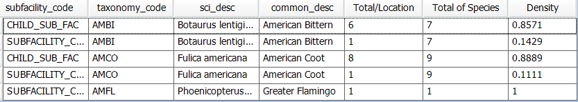 Description: This report output includes the "Total per Subfacility" for the quantity of each species per subfacility, and the Total of Species (quantity) for all subfacilities. It generates the Density for individual species by dividing the "Total per Subfacility" by the "Total of Species".