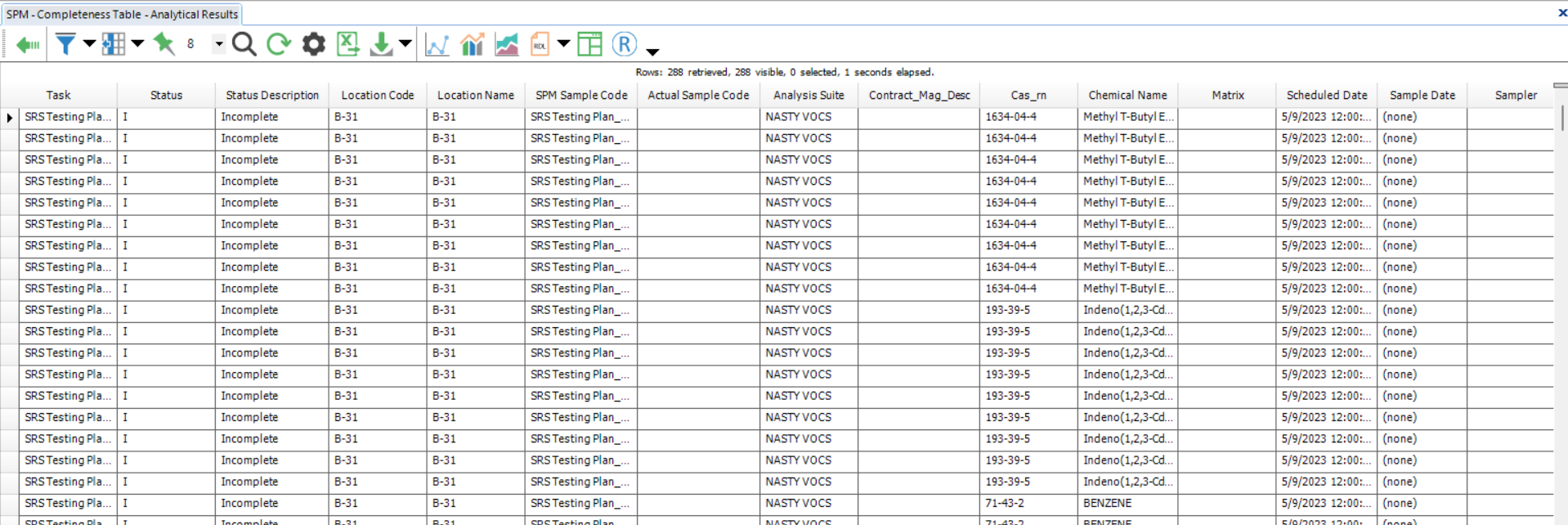 Description: The SPM - Completeness Table - Analytical Results report gives a comparison between analytical and field results that had been scheduled to occur and the data that has been received in the EQuIS data tables. The report grid has a Status column to show complete and incomplete tasks. This report is intended to generate a grid output to be used in Enterprise and Microsoft Power BI Dashboards.