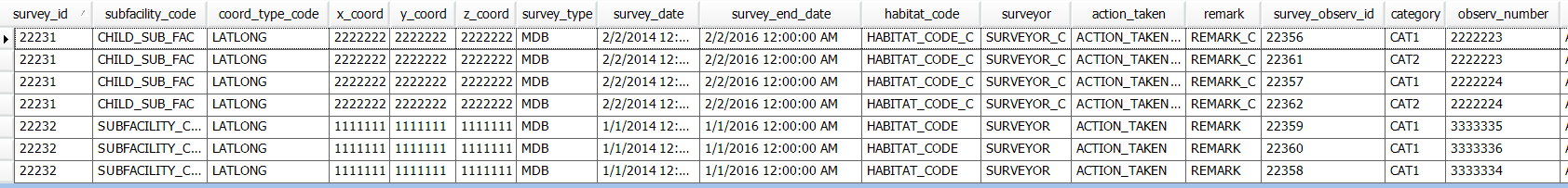 Tables: DT_SUBFACILITY, RT_TAXONOMY, DT_SURVEY, DT_SURVEY_OBSERV