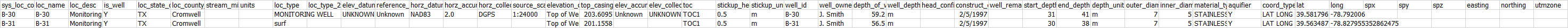 ELEVATION_OF TOP_CASING_ELEV ELEV_ACCURACY_VALUE ELEV_COLLECT_METHOD_CODE TOC STICKUP_HEIGHT STICKUP_UNIT WELL_ID WELL_OWNER DEPTH_OF_WELL WELL_DEPTH_UNIT HEAD_CONFIGURATION CONSTRUCT_COMPLETE_DATE WELL_REMARK START_DEPTH END_DEPTH |