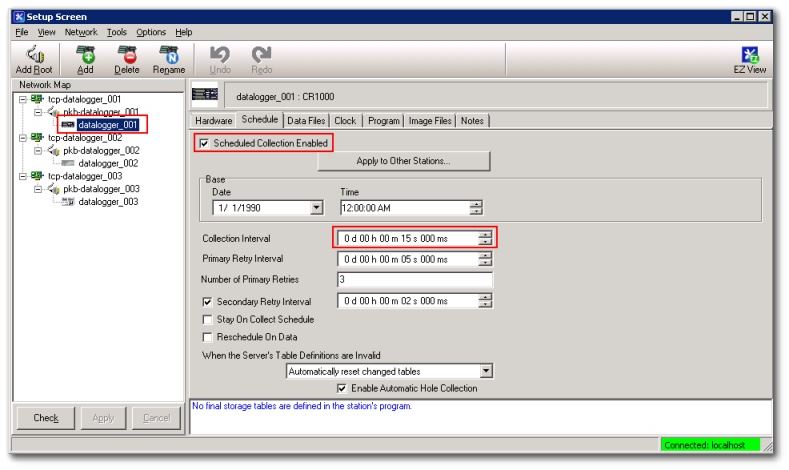 Scheduled data collection must be configured within LoggerNet for the desired data logger(s). Data from the data logger(s) is downloaded by LoggerNet and written to local files on a specified schedule. The Setup Screen (within LoggerNet) shows each data logger that LoggerNet is connected to. The Schedule tab allows you to enable scheduled data collection for the selected logger and define the Collection Interval. The following image illustrates an example data logger that is scheduled for data collection every fifteen (15) seconds: