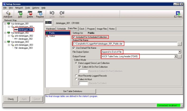 The Data Files tab allows you to choose the desired table(s) and an output file name. Be sure to set the File Output Option to Append to End of File and the Output Format option to ASCII Table Data, Long header (TOA5) as shown here: