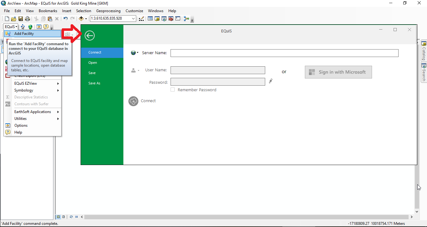 1.In ArcMap Click on EQuIS->Add Facility to open an EQuIS Professional login screen.