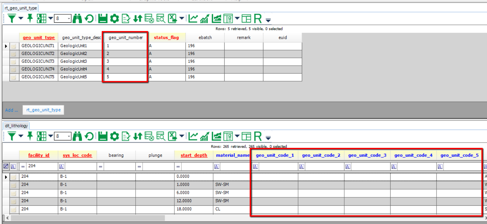 RT_GEO_UNIT_TYPE.GEO_UNIT_NUMBER field corresponds to the GEO_UNIT_CODE_1 through _5 fields in DT_LITHOLOGY, as shown here: