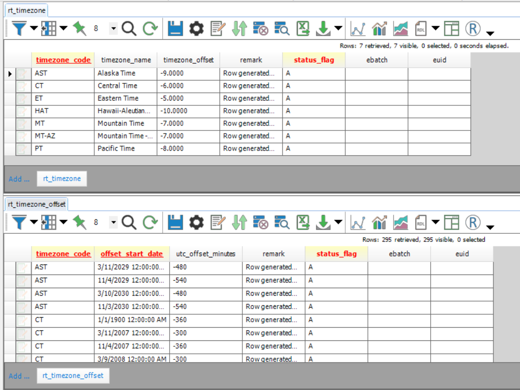 << Click to Display Table of Contents >> Navigation: Professional > Tables & Views > Reference Value Tables (RT) > RT_TIMEZONE and RT_TIMEZONE_OFFSET |
