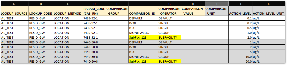 ▪If there is no Action Level specified for the unlisted locations, enter the word ‘NULL’ in the ACTION_LEVEL column for the DEFAULT row.
