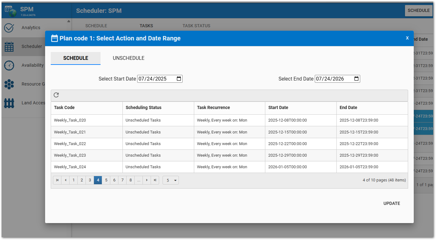 This will act similar to the Batch Processor functionality in SPM Desktop by updating the scheduling status of any tasks in the provided time frame. In the Schedule dialog, selecting the Schedule or Unschedule tabs will display planned or scheduled tasks accordingly.