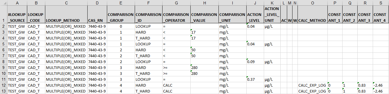 •LOOKUP_METHOD (255 char): The entries must match one of the following method names exactly: GROUP_FORMULA, GROUP_FORMULA_2, or GROUP_FORMULA_3. (It is unusual for more than one value to work in this column, but for this particular Advanced Action Level, the user may need to run both CALC_METHODs below for the same PARAM_CODE to determine separate Acute and Chronic Action Levels.)