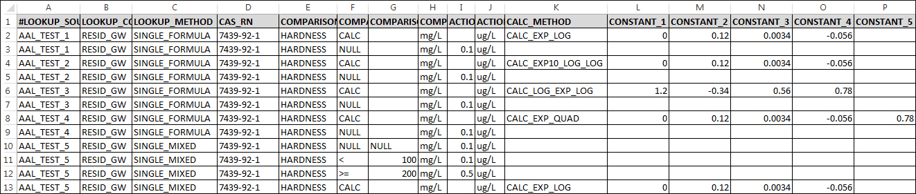 Populate the following columns of DT_ACTION_LEVEL_LOOKUP: LOOKUP_SOURCE: Agency's name (Abbr.) LOOKUP_CODE: User determined code LOOKUP_METHOD: 'SINGLE_FORMULA' PARAM_CODE: '7439-92-1' COMPARISON_ID: 'HARDNESS' COMPARISON_OPERATOR: 'CALC' COMPARISON_UNIT: 'mg/L' ACTION_LEVEL_UNIT: 'ug/L' CALC_METHOD: 'CALC_EXP_LOG' CONSTANT_1: 0 CONSTANT_2: 1.2 CONSTANT_3: 0.34 CONSTANT_4: -0.056 CONSTANT_5: NULL |